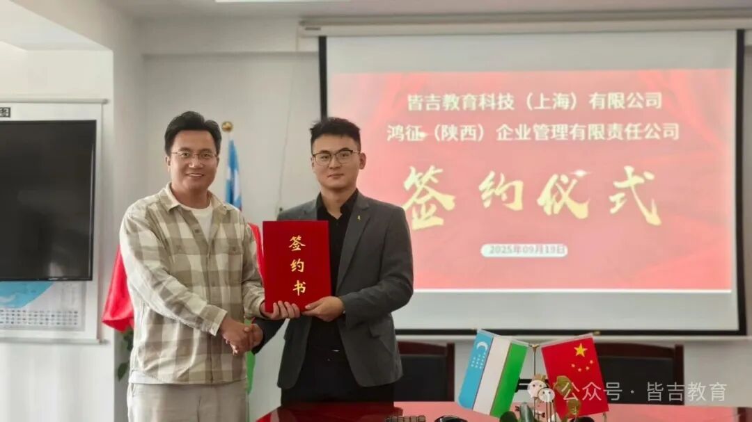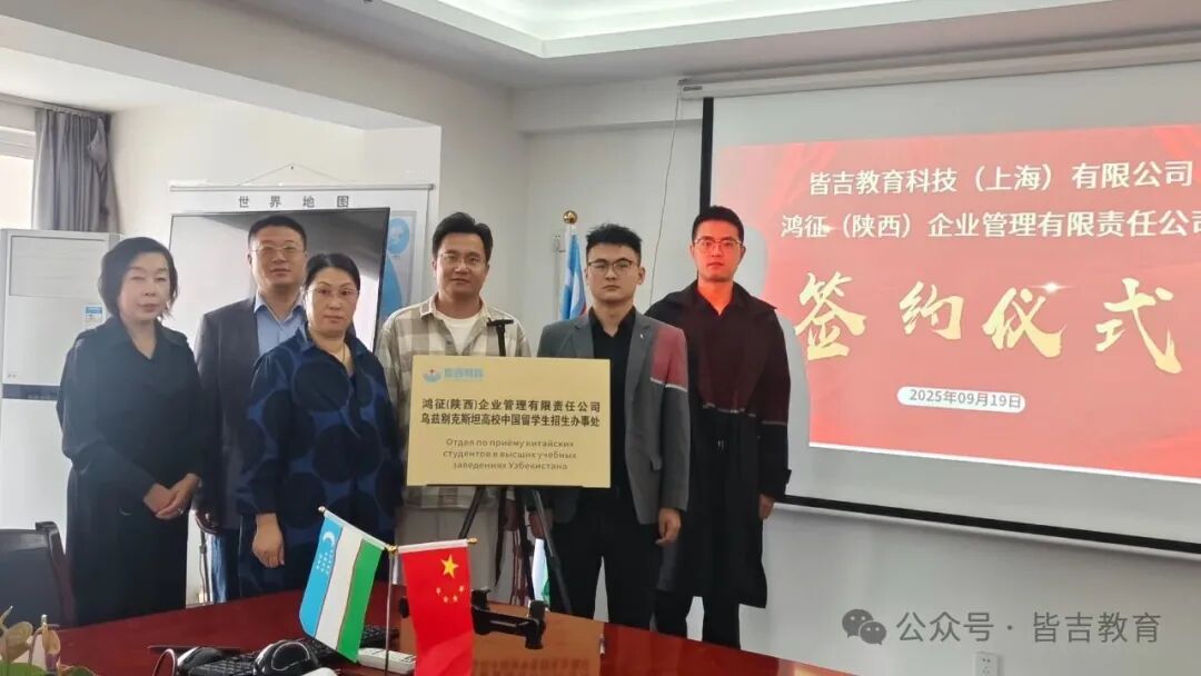 2025年9月19日,鸿征(陕西)企业管理有限责任公司总经理何涛、副总经理杨天莅临皆吉教育,举行乌兹别克斯坦高校招生签约及揭牌活动。
